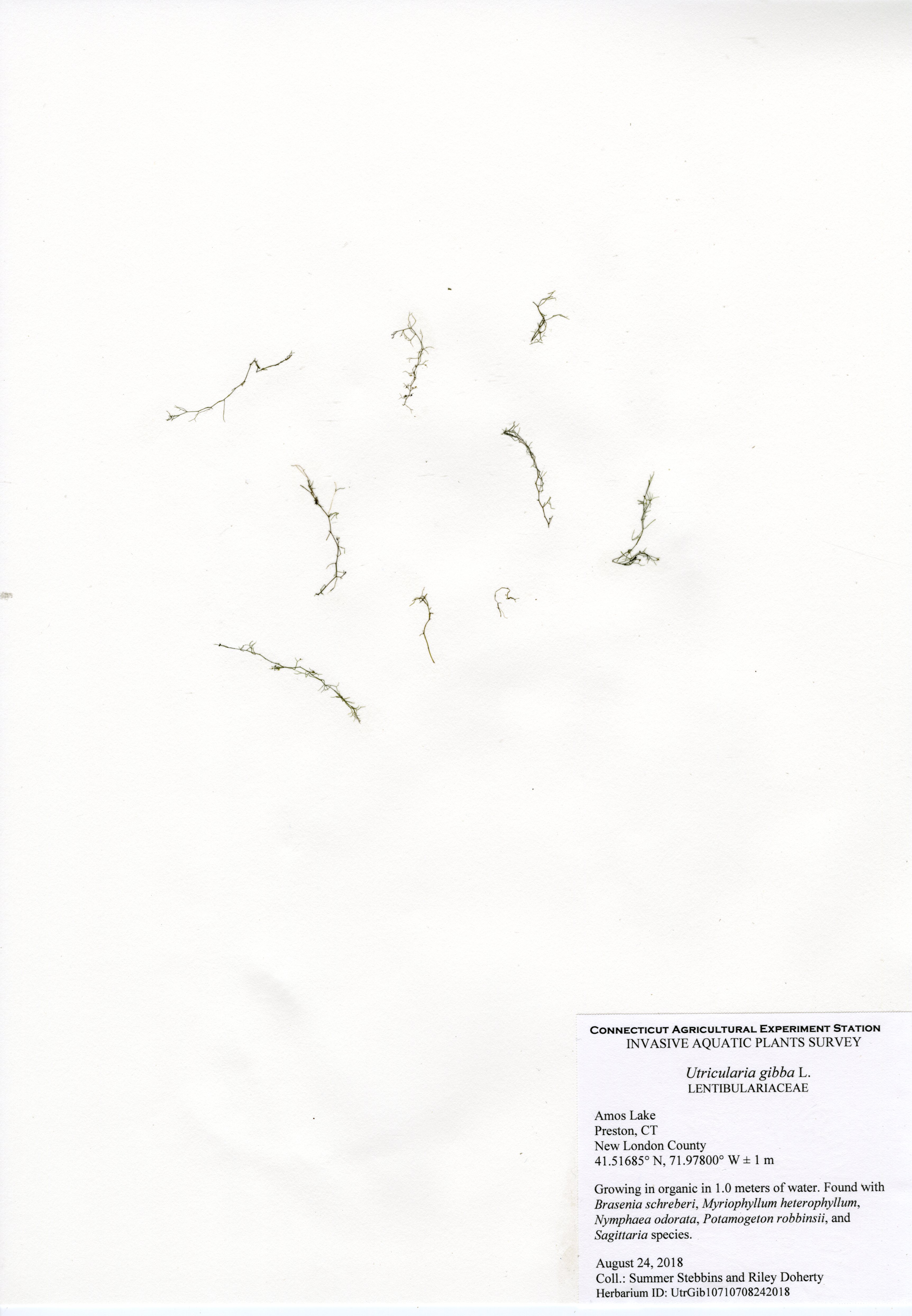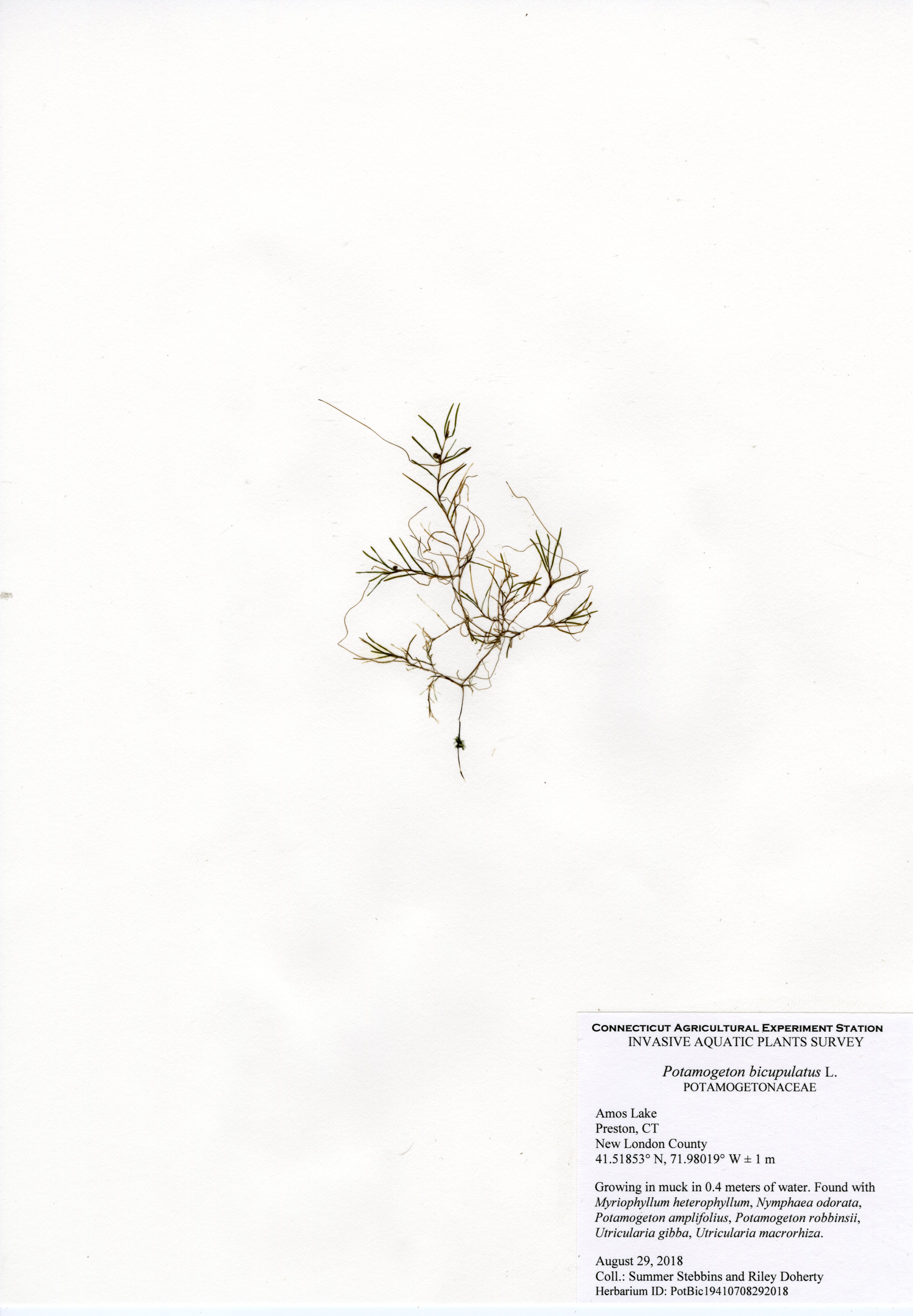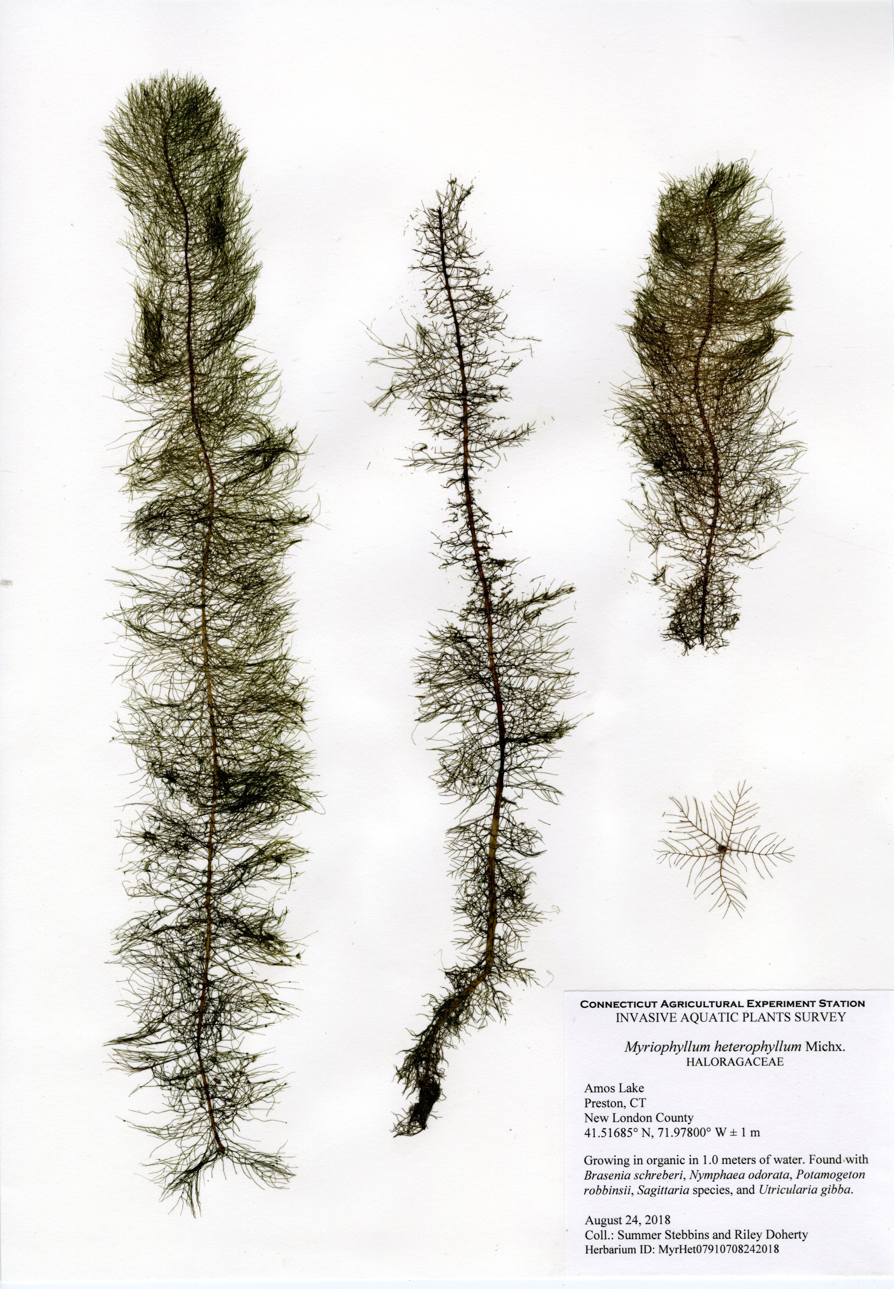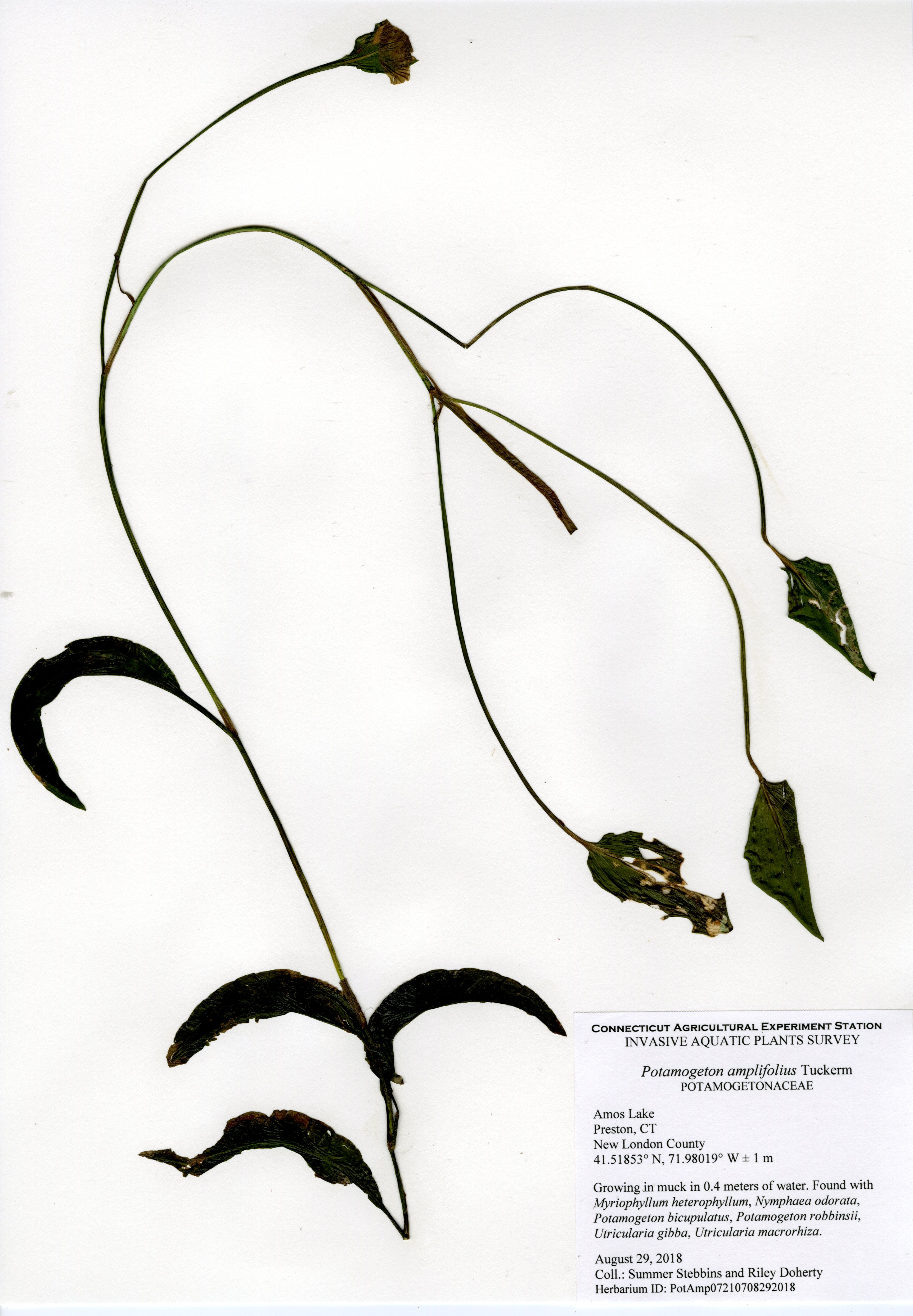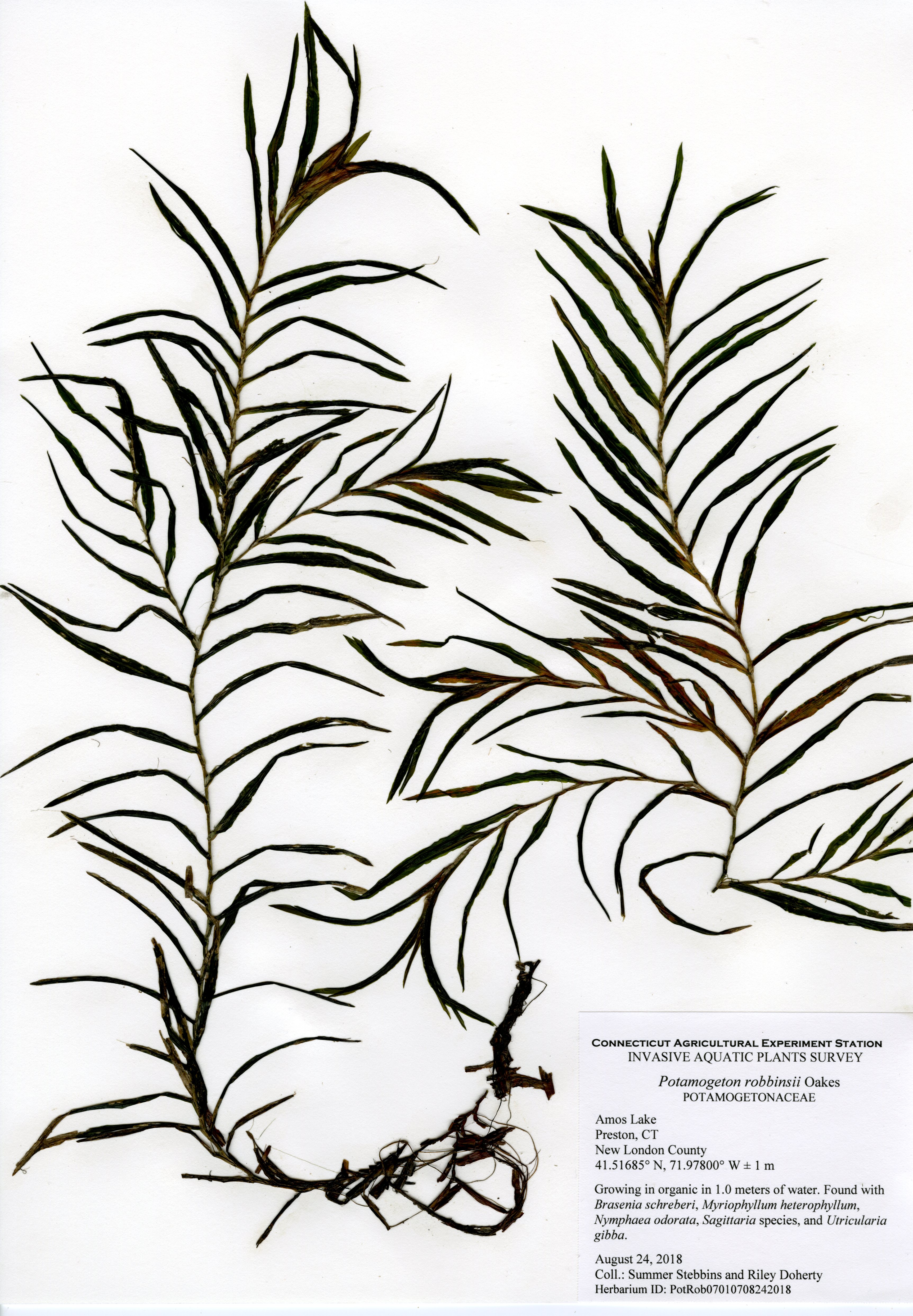 The 2018 vegetative survey of Amos Lake was the third survey performed by CAES IAPP of the waterbody; it was previously surveyed in 2006 and 2013. Similar to previous surveys, variable-leaf watermilfoil (Myriophyllum heterophyllum) was the only invasive found in the lake. It has spread in abundance from a few locations on the western perimeter of the lake to more of the western perimeter as well as a cove on the eastern side. Mudmat (Glossostigma cleistanthum) is also a non-native plant found in the lake, but it is not considered a state-listed invasive species and is rarely a nuisance. Common reed (Phragmites australis), an invasive wetland plant, was found along the northern shoreline of the lake. As found in 2013, Robbins’ pondweed (Potamogeton robbinsii) was the most common plant. It covers almost the entire perimeter of the lake. Overall presence of vegetation increased in 2018 from previous years with dense populations of plants in the coves along the east and west shorelines of the lake. Species richness, however, decreased from 29 in 2013 to 22 species.