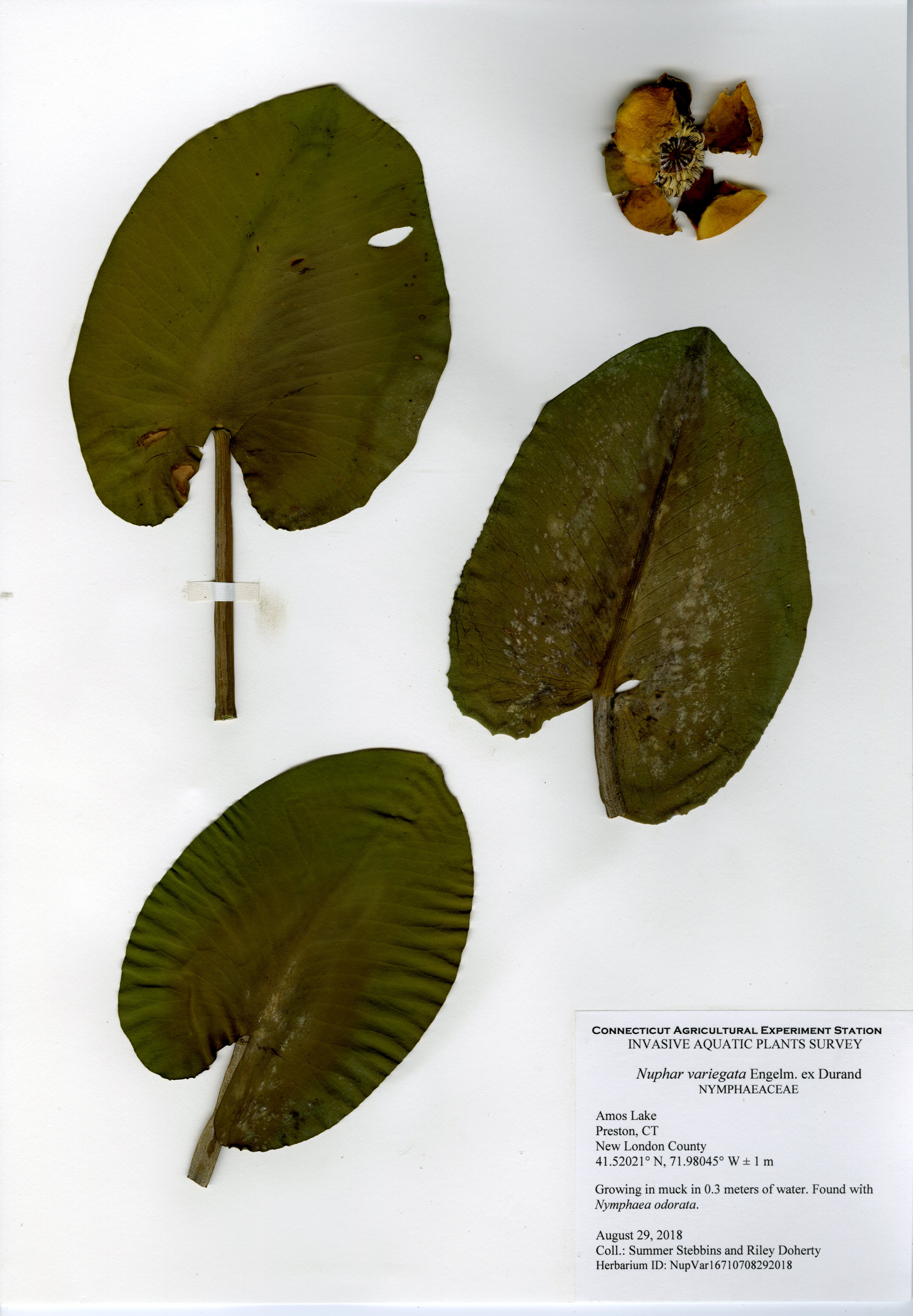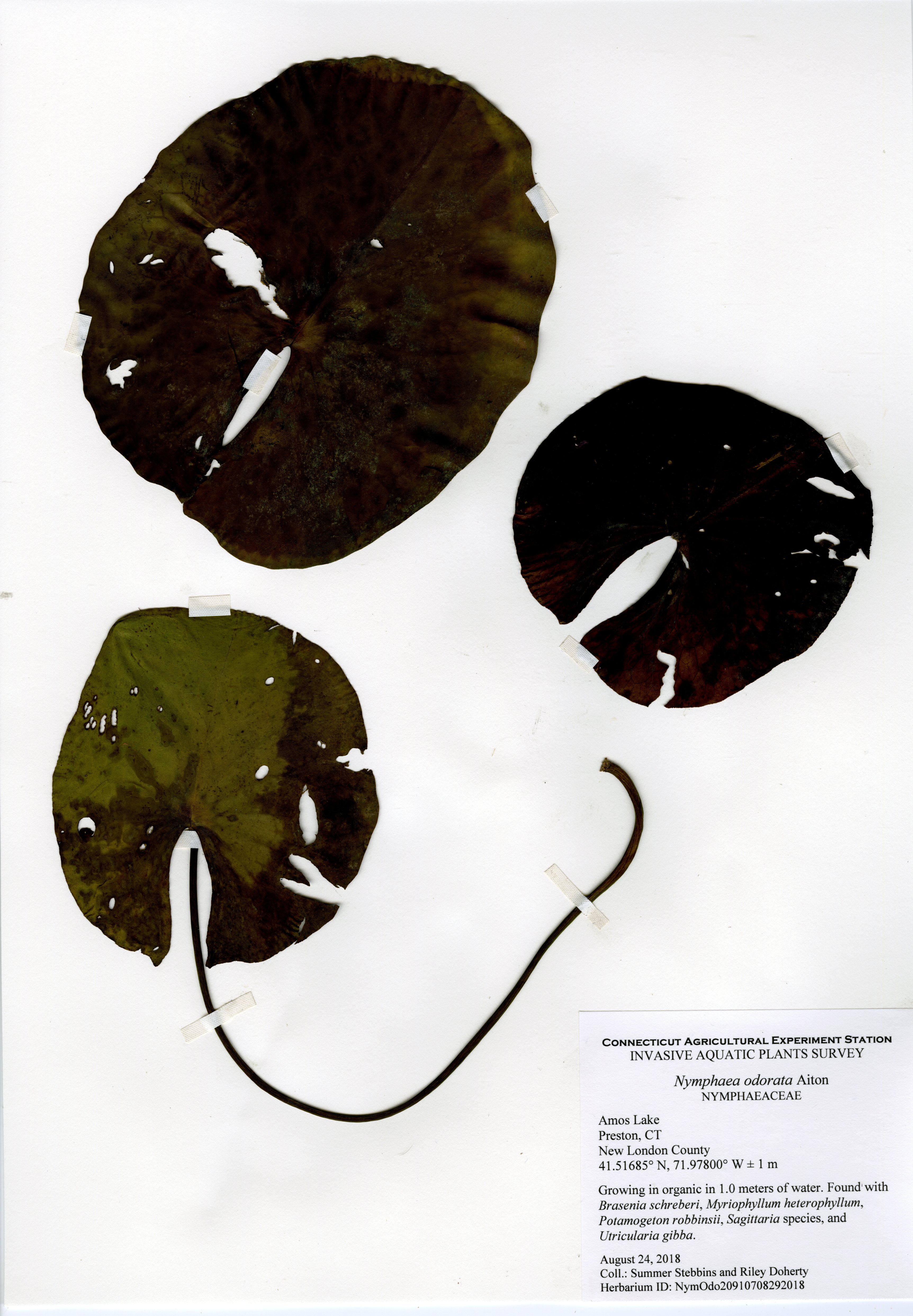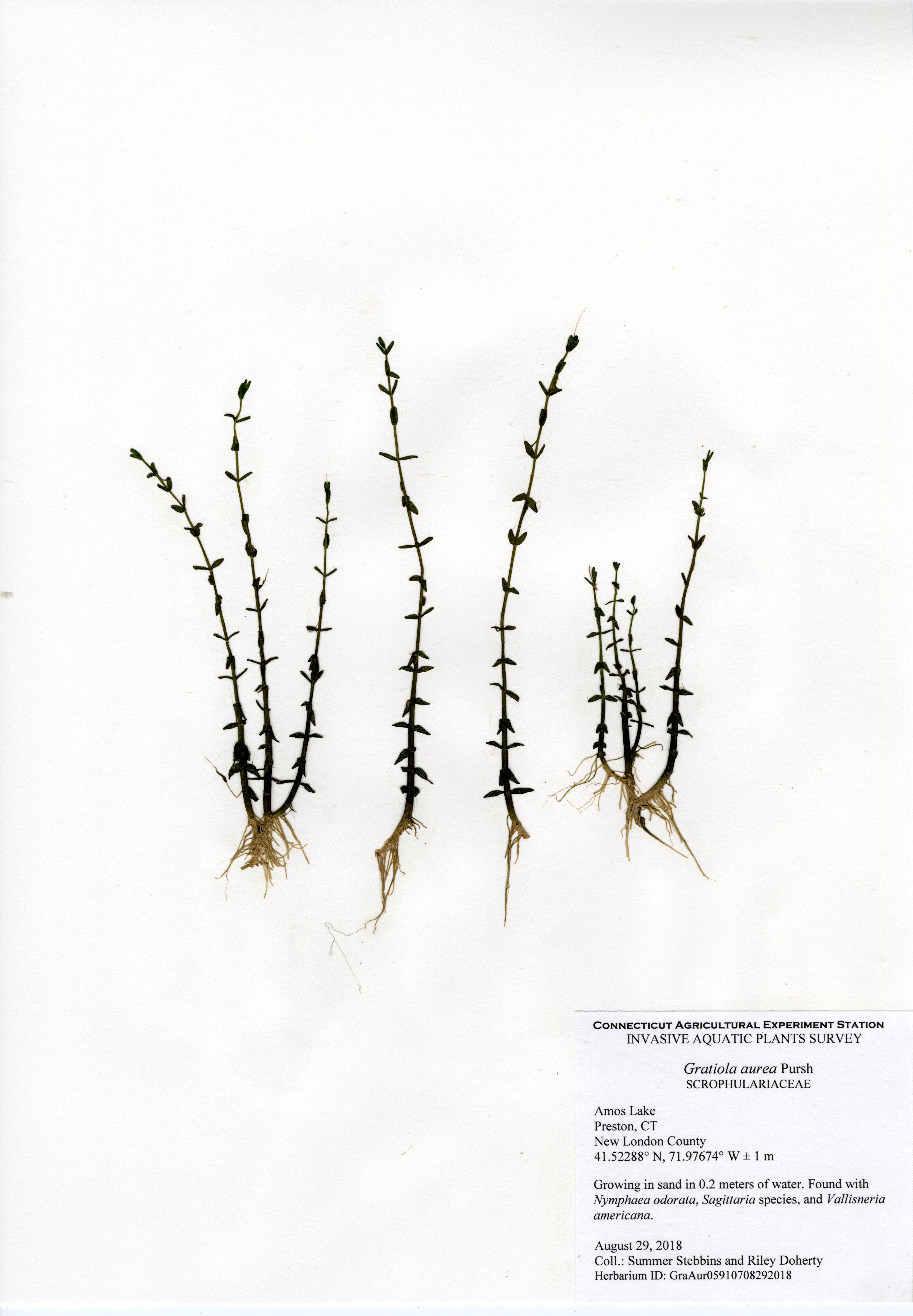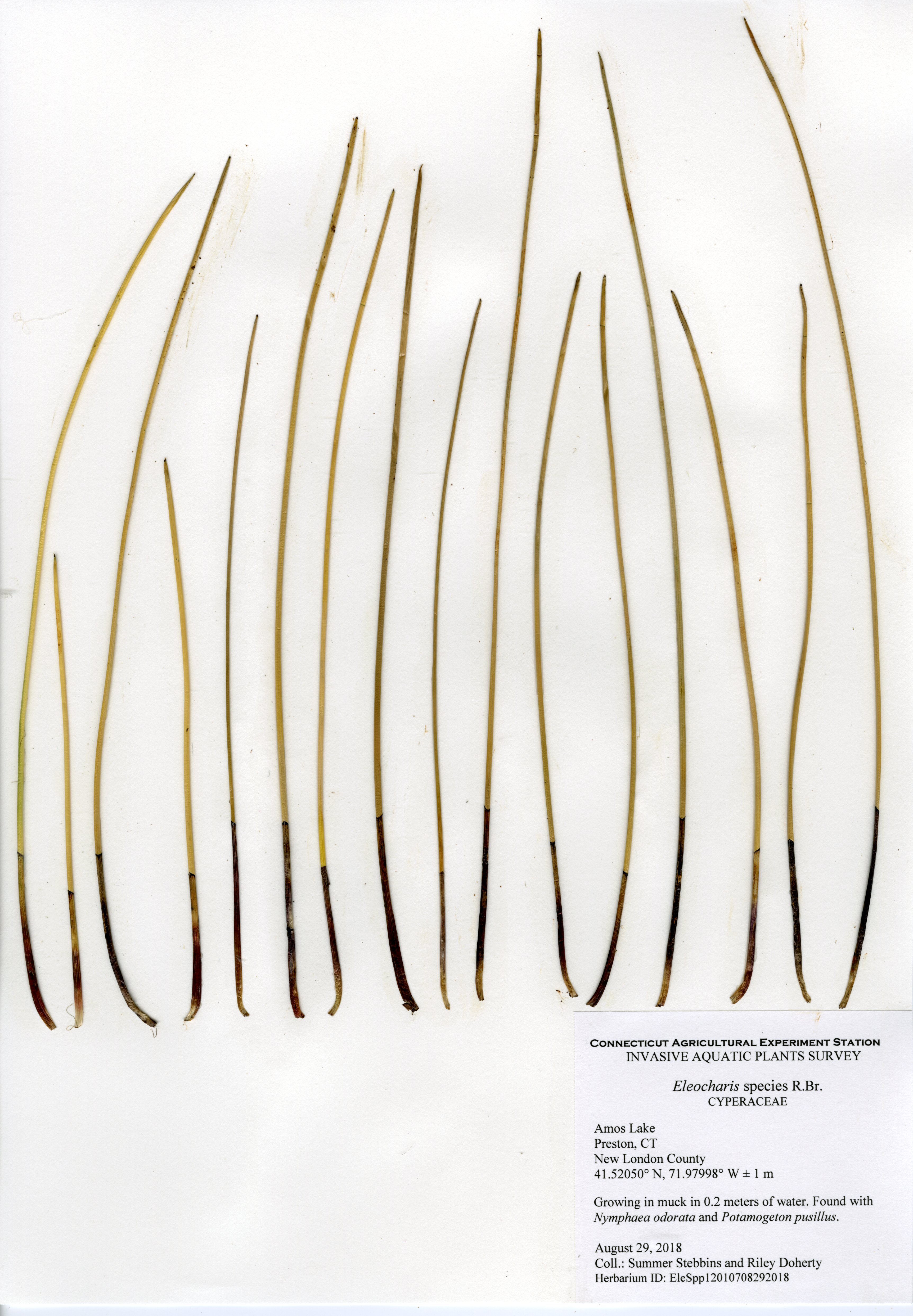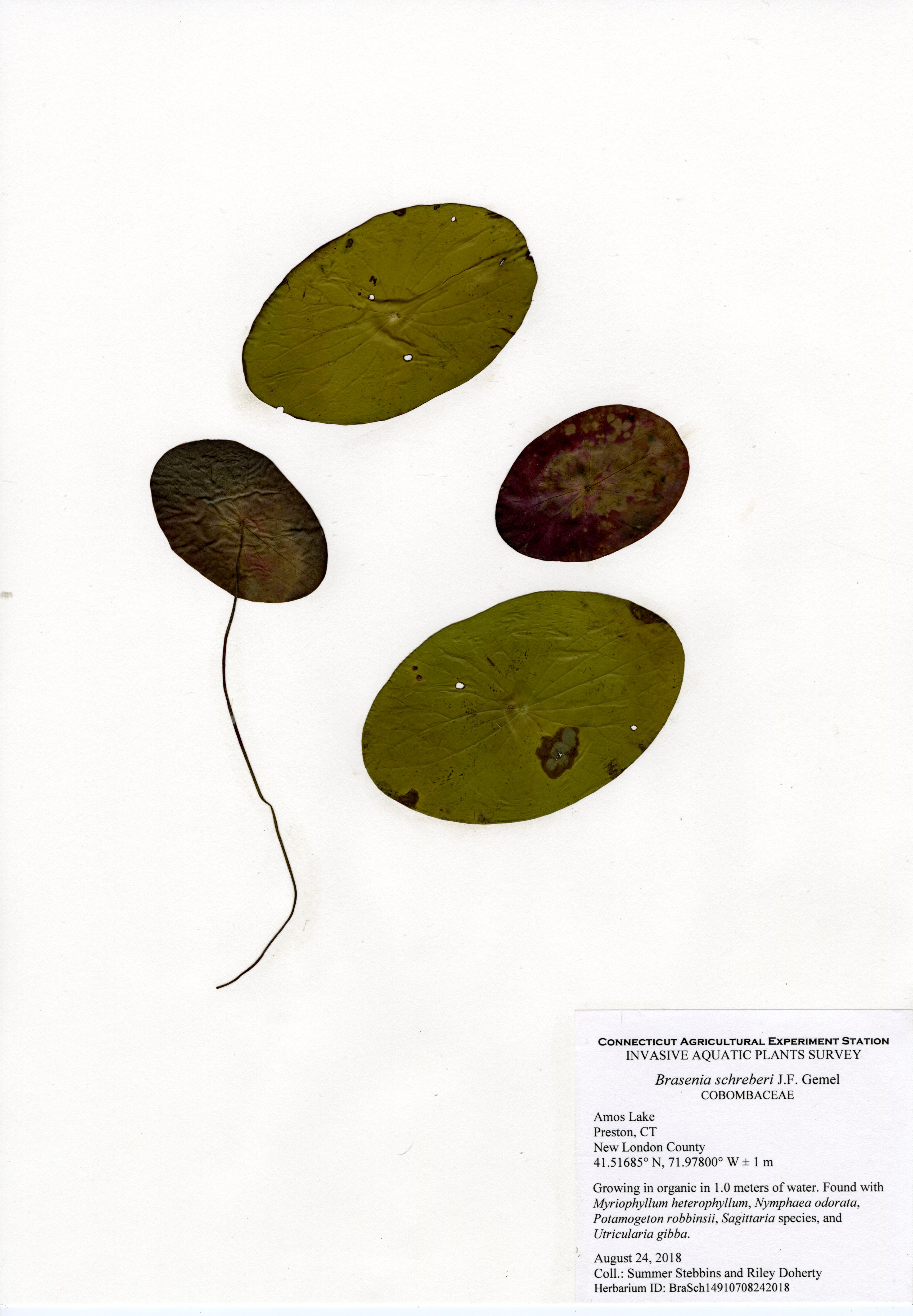 The 2018 vegetative survey of Amos Lake was the third survey performed by CAES IAPP of the waterbody; it was previously surveyed in 2006 and 2013. Similar to previous surveys, variable-leaf watermilfoil (Myriophyllum heterophyllum) was the only invasive found in the lake. It has spread in abundance from a few locations on the western perimeter of the lake to more of the western perimeter as well as a cove on the eastern side. Mudmat (Glossostigma cleistanthum) is also a non-native plant found in the lake, but it is not considered a state-listed invasive species and is rarely a nuisance. Common reed (Phragmites australis), an invasive wetland plant, was found along the northern shoreline of the lake. As found in 2013, Robbins’ pondweed (Potamogeton robbinsii) was the most common plant. It covers almost the entire perimeter of the lake. Overall presence of vegetation increased in 2018 from previous years with dense populations of plants in the coves along the east and west shorelines of the lake. Species richness, however, decreased from 29 in 2013 to 22 species.