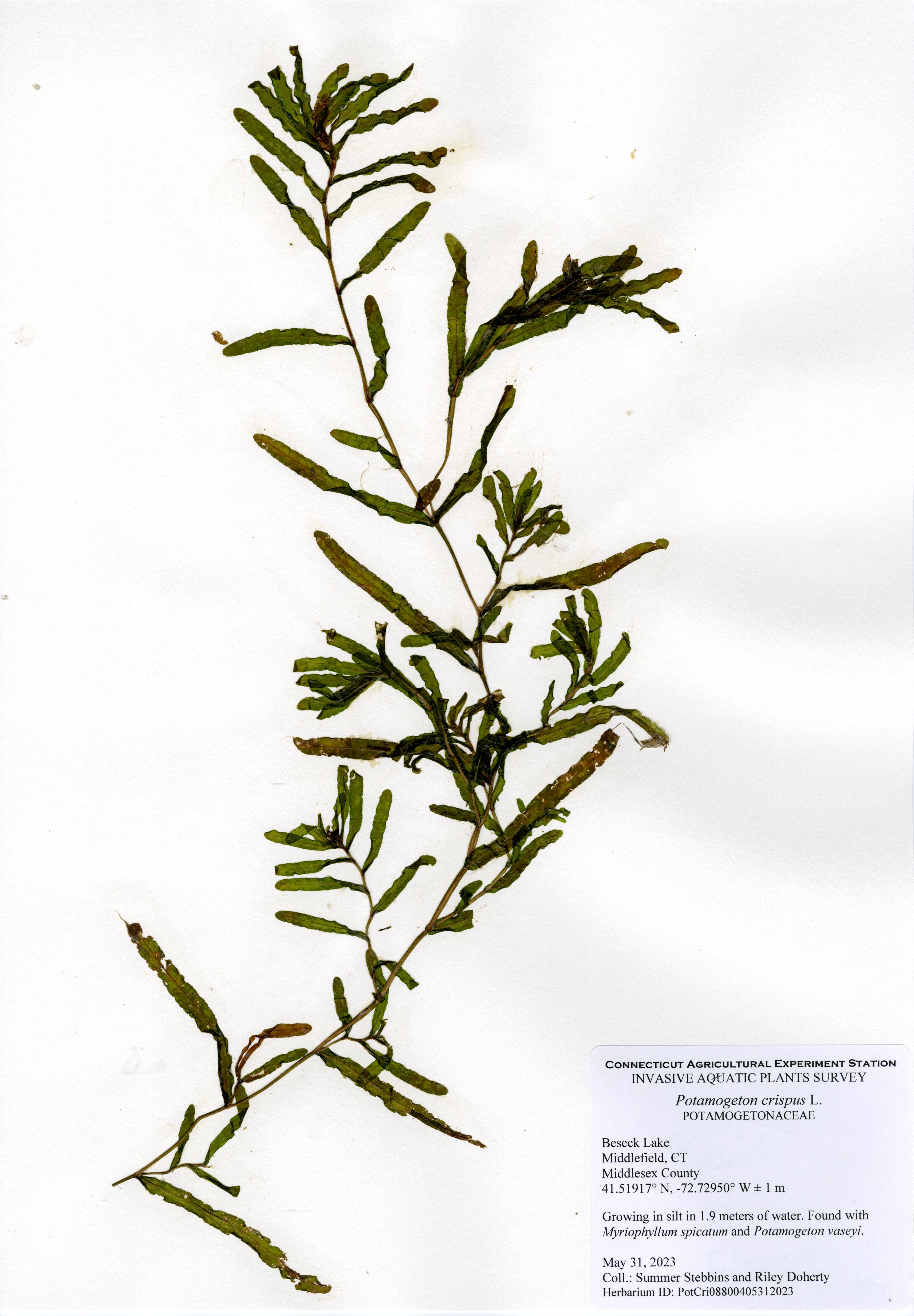 A total of 22 species were found in the 2023 survey similarly to the 2017 survey. All invasive plants found in 2017 were found again except for minor naiad (Najas minor). The northern and southern most ends of the lake were dominated by large patches of Eurasian watermilfoil (Myriophyllum spicatum) covering more of the lake than in 2017. Curlyleaf pondweed (Potamogeton crispus) was found relatively consistently in small patches around the whole lake. Since the 2017 survey the patch of Phragmites (Phragmites australis) at the southernmost end of the lake has become significantly smaller. Water chestnut (Trapa natans) was seen for the first time in a very small patch close to the beach area and was hand pulled by OAIS.