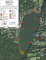Beseck Lake is a 113-acre lake located in Middlefield, CT. There is a public boat launch along the eastern shoreline. The lake is used for a variety of recreational activities such as boating, water skiing, jet skiing, swimming, and fishing. There is a private town beach on the western side of the lake open to town residents. A dam is located at the end of the long, deep cove along the eastern shore. Most of the shoreline is developed except for a park at the southern end. Beseck Lake's maximum depth is 24 feet with an average depth of 12 feet. This is the fourth survey that CAES OAIS has completed of Beseck Lake.