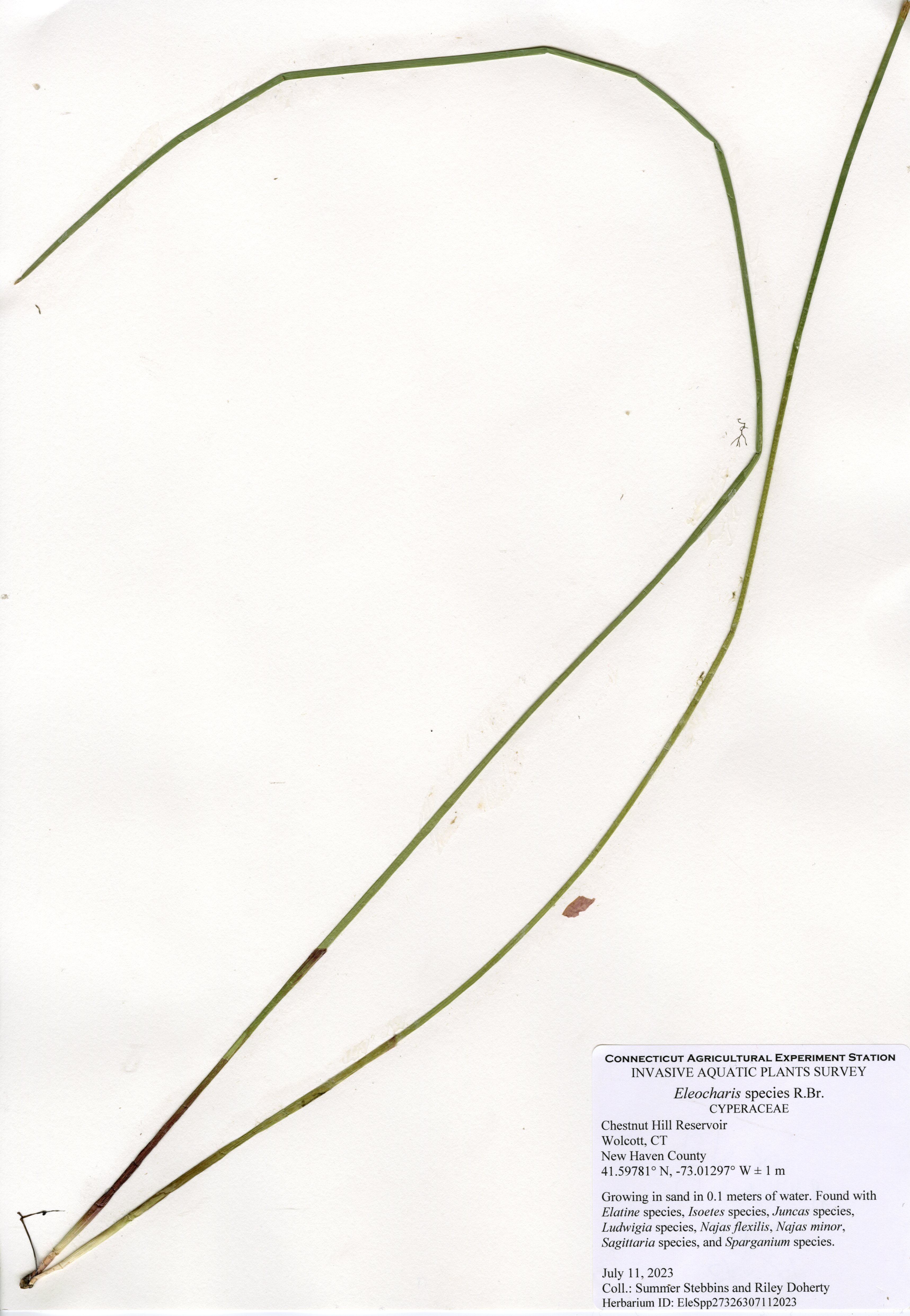The center of Chestnut Hill Reservoir is too deep to support plants, but plants were present throughout the majority of areas shallow enough to support plants. Fourteen native species were found in the reservoir. Eelgrass (Vallisneria americana) and Berchtold’s pondweed (Potamogeton berchtoldii) were the most common plants and found throughout the shallow areas. Cattails (Typha species) and rush (Juncus species) are native wetland species. Arrowhead (Sagittaria species), bur-reed (Sparganium species), quillwort (Isoetes species), primrose-willow (Ludwigia species), spikerush (Eleocharis species), and waterwort (Elatine species) are low-growing native species found in very shallow waters near the shoreline. Ribbon-leaf pondweed (Potamogeton epihydrus), snailseed pondweed (Potamogeton bicupulatus), and western waterweed (Elodea nuttallii) were found near transects 1 and 5.