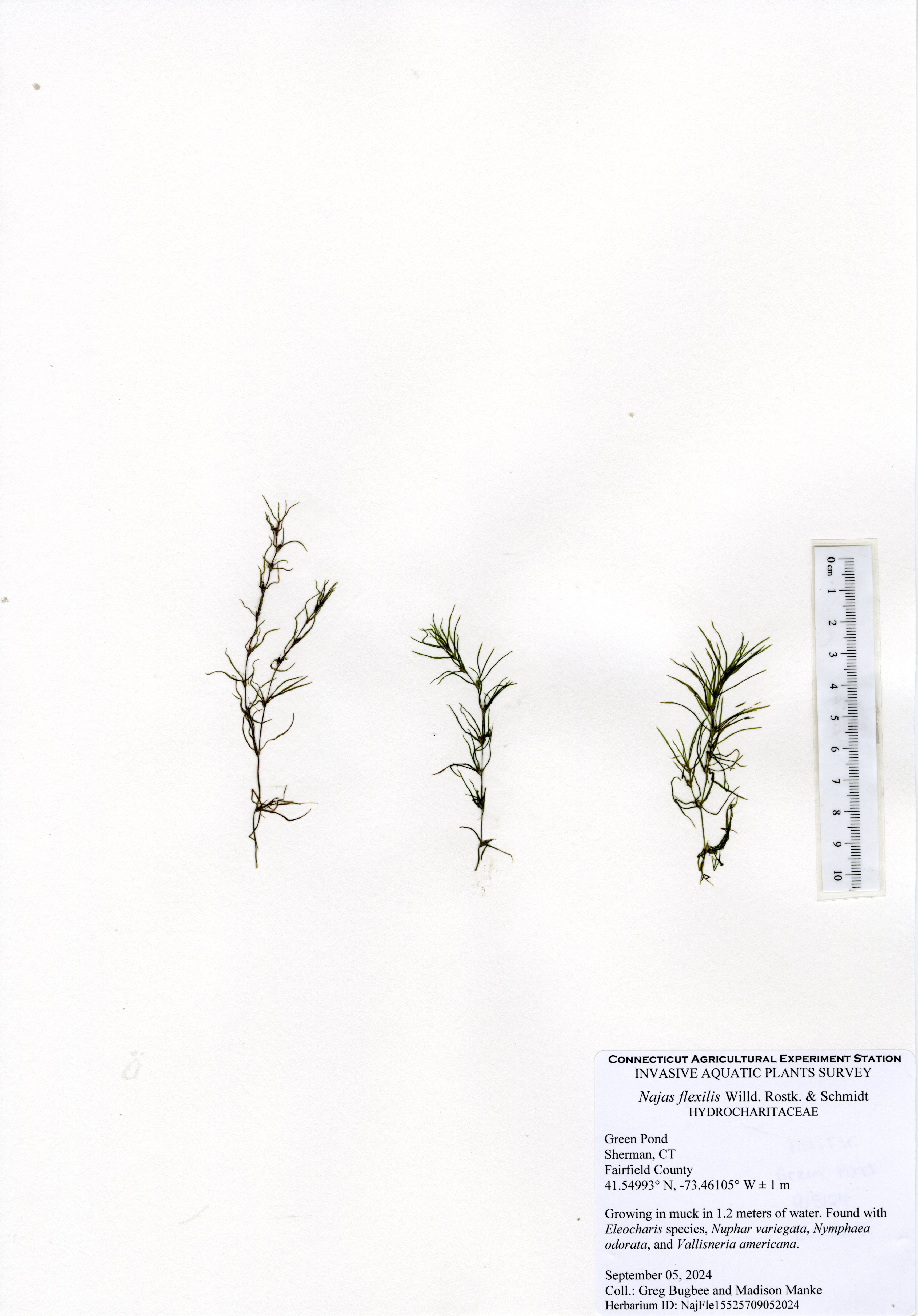 Minor naiad (Najas minor) was the other invasive species found in the lake in 2022. It was found by the beach in the north end and in a few locations along the western side of the pond. Minor naiad is an annual plant that regrows each year from the previous year’s seed. Thus, it is not noticeable until early to mid-summer when it grows in patches in the shallows. It often is most abundant in and around beaches. CAES OAIS is not aware of any control practices performed on this plant in Connecticut apparently because it is not a nuisance. If management in beach areas is desired, it can easily be removed with a rake. In 2023, the herbicide ProcellaCOR was applied to control Eurasian watermilfoil.