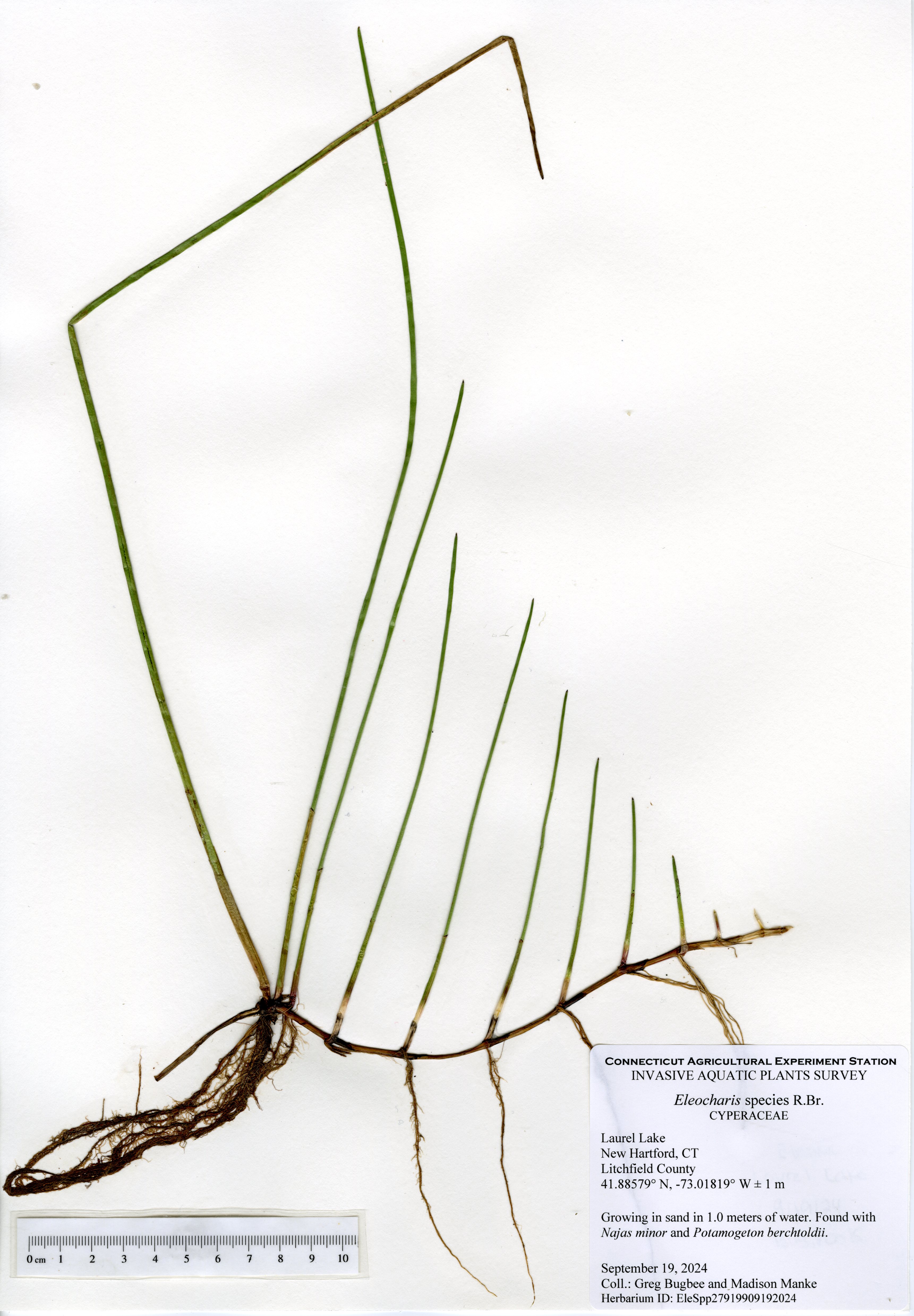 The 2024 aquatic plant survey was the sixth survey of Laurel Lake performed by the Connecticut Agricultural Experiment Station (CAES) Office of Aquatic Invasive Species (OAIS) since 2012. In 2024, we found 15 aquatic plant species including one invasive: minor naiad (Najas minor). Minor naiad is an annual that propagates from seed each year. There was less minor naiad found in 2024 compared to 2022, but it occurred in many of the same parts of the lake. The majority of minor naiad was found in the southern half of the lake, with a small population found in the very north end of the lake by the cattails. Two wetland species were also mapped: native cattail (Typha species) and invasive phragmites (Phragmites australis). The phragmites was found in the same spot as in 2022, by the western cove of the lake, and was roughly the same size.