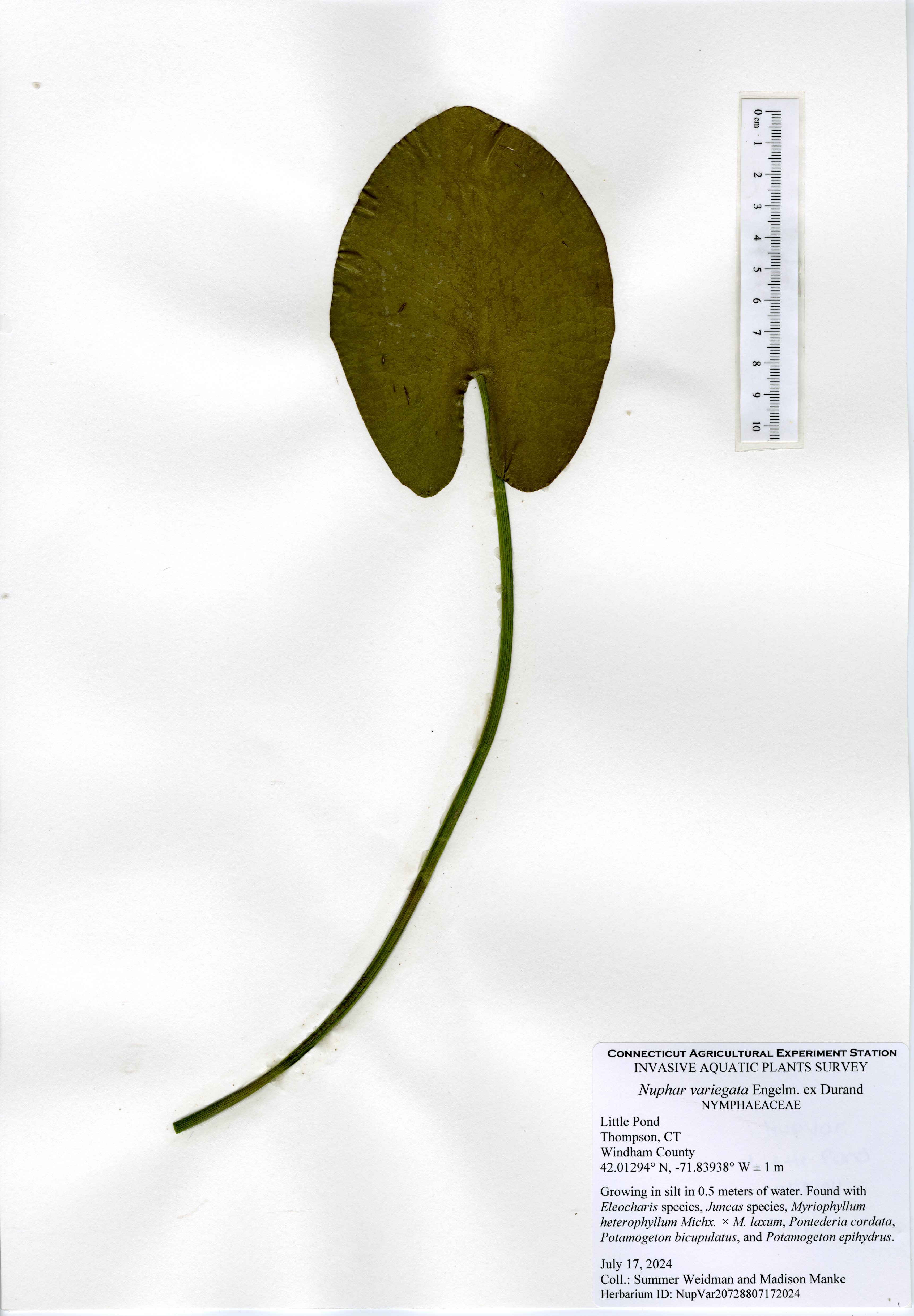 The rest of the aquatic vegetation found in the pond was native. Of particular importance is dollarweed (Hydrocotyle umbellata) also known as water pennywort, a threatened plant, found along the northwestern side of the pond in small patches. White water lily (Nymphaea odorata) was the most abundant species, occurring in small patches along the entire shoreline. Other prevalent species included pickerelweed (Pontederia cordata) and yellow water lily (Nuphar variegata), both of which were widespread throughout the pond. All other native species were present in smaller populations, distributed across various areas of the pond. Overall, Little Pond supports a diverse array of native aquatic plant species, with relatively limited patches of invasive plant populations.