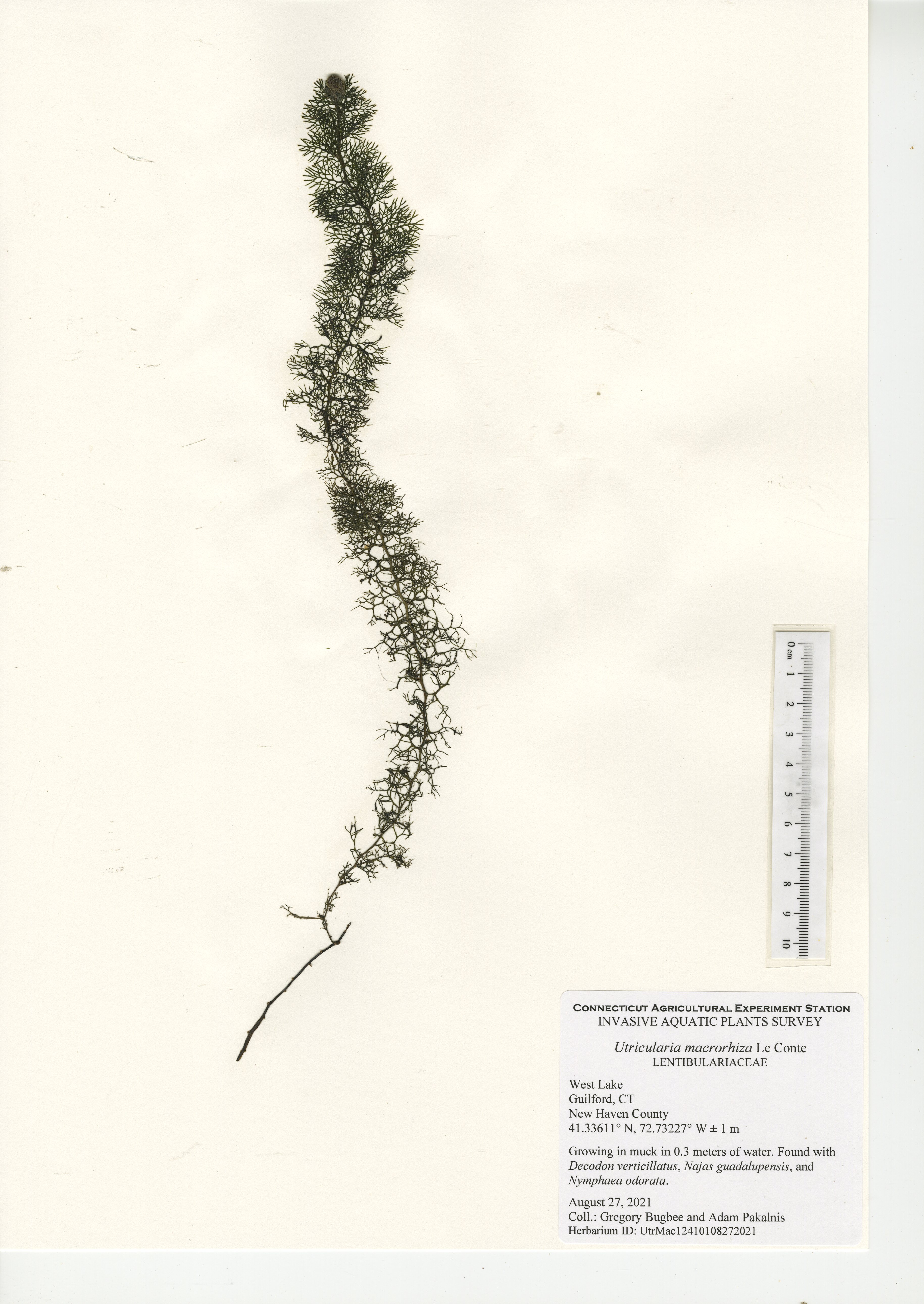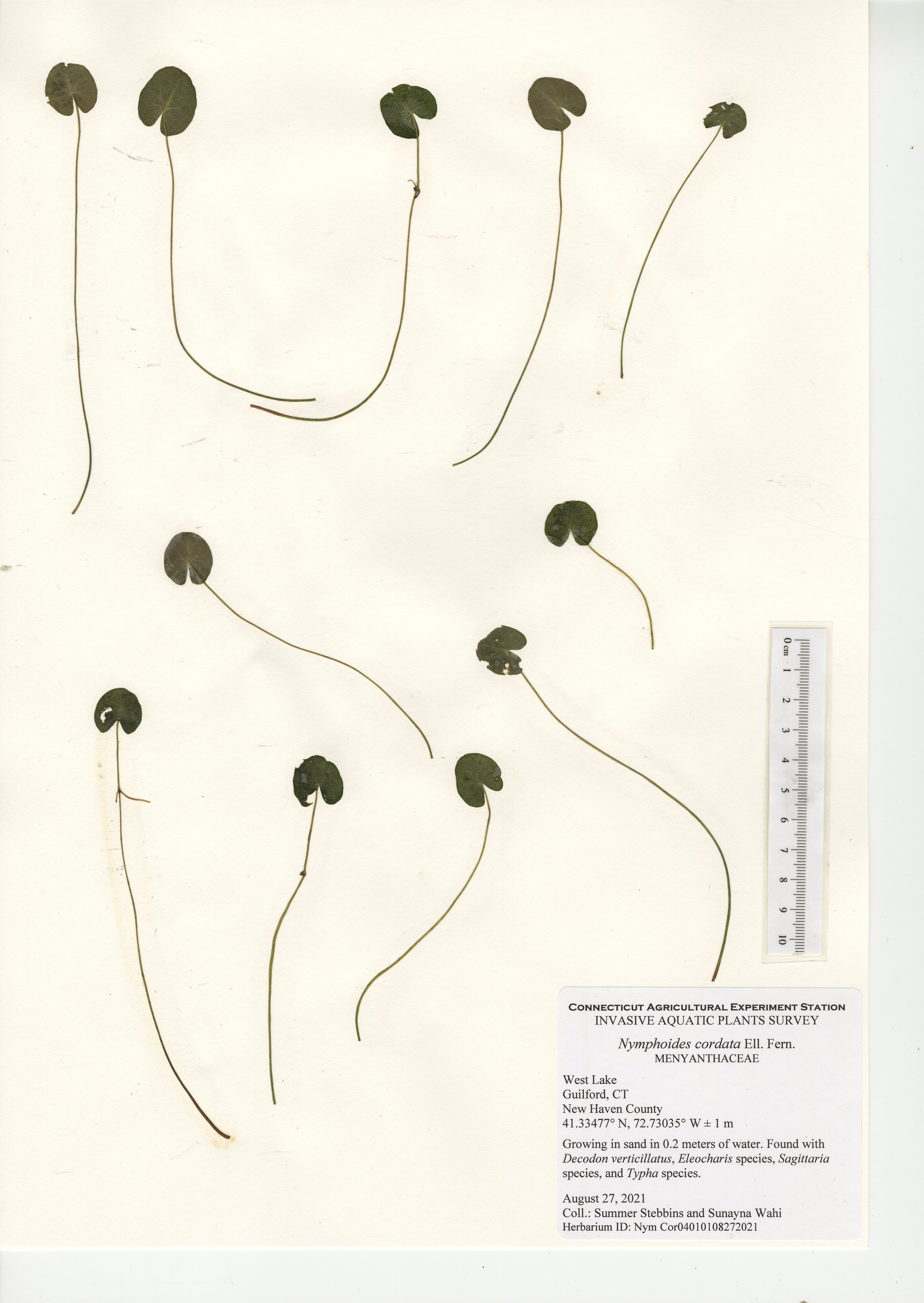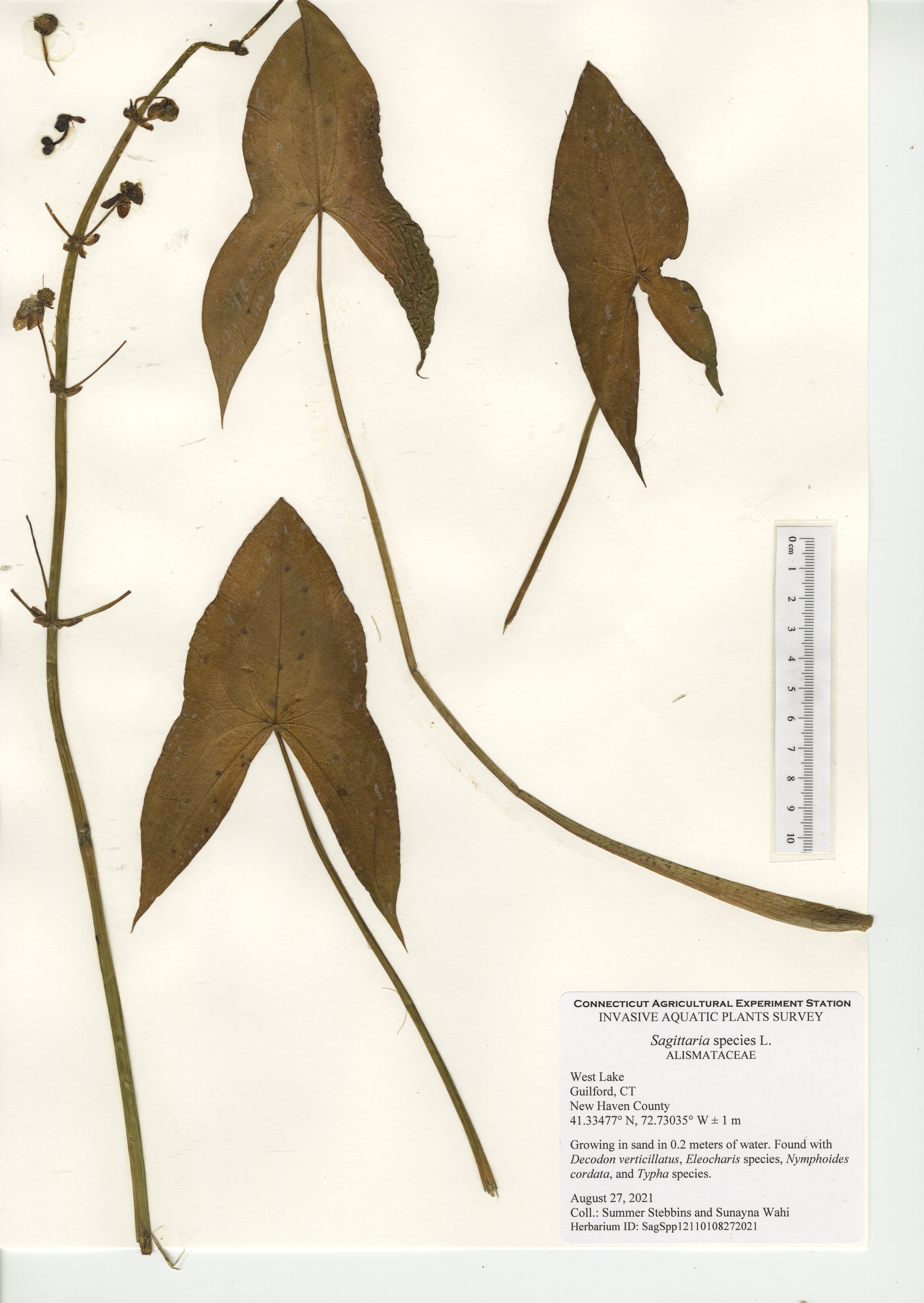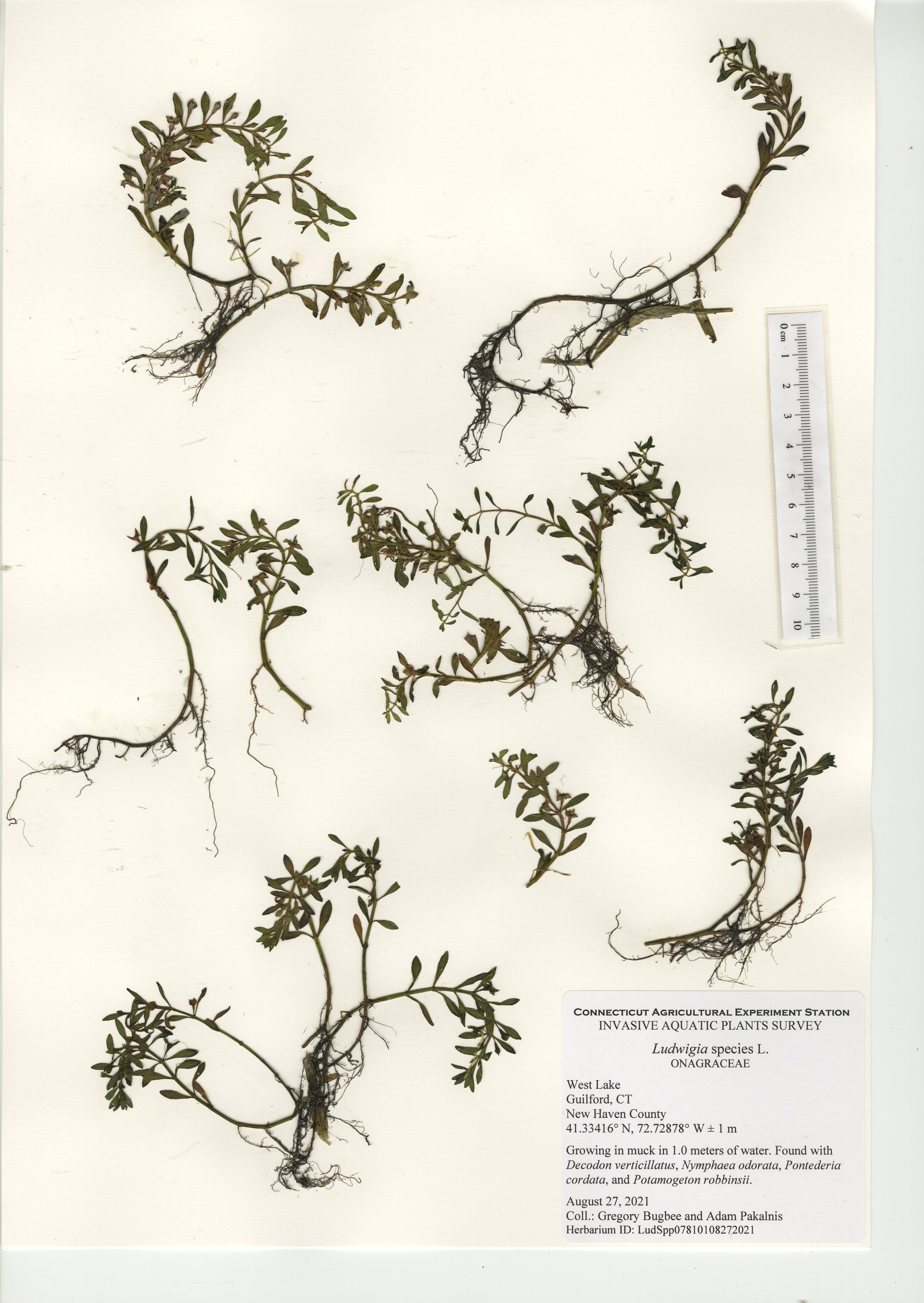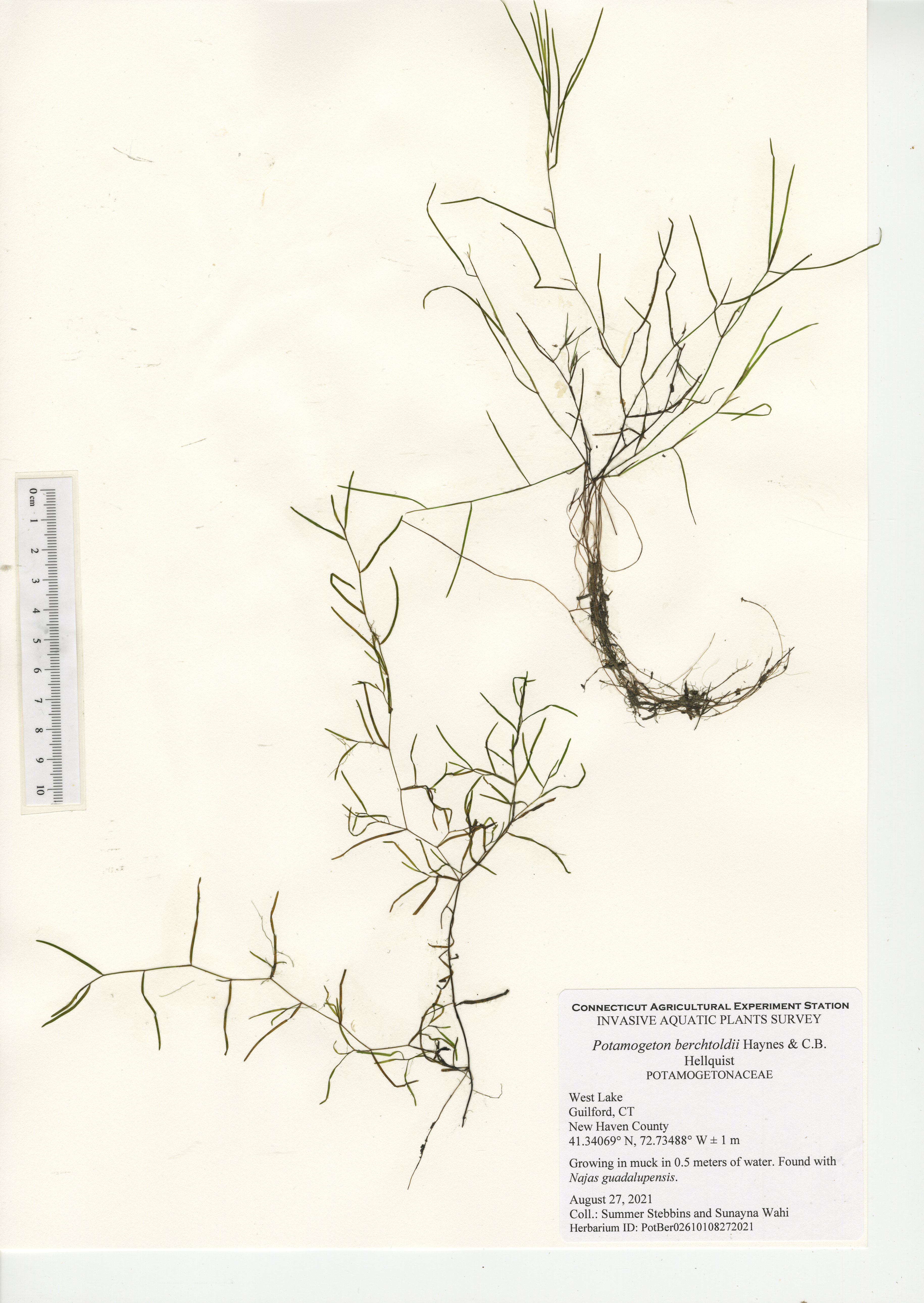 West Lake is a 52-acre lake located in Guilford, CT. The lake was surveyed for the third time in 2021 by CAES IAPP with the previous surveys occurring in 2005 and 2010. Nineteen native species were found in 2021, compared to 27 in 2010 and 18 in 2005. Minor naiad (Najas minor) was the only non-native invasive aquatic plant found during the 2005 and 2010 surveys; however, it was not observed during our 2021 survey. No invasive aquatic plants were therefore observed in 2021. This along with the decline in native species was likely caused by an aquatic herbicide application performed approximately a month prior to our survey. Two invasive non-aquatic wetland plants were found during the 2021 survey: phragmites (Phragmites australis) and purple loosestrife (Lythrum salicaria). Our documentation of non-aquatic plant species is outside the scope of CAES IAPP surveys and is performed at the discretion of the surveyor. Comparing their presence from survey-to-survey is therefore unreliable.
