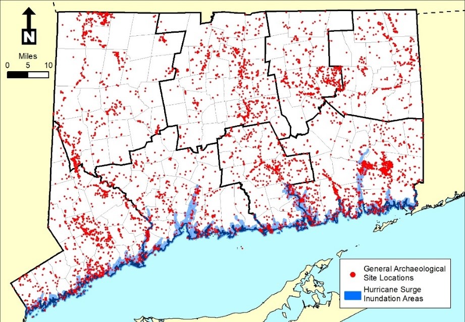 Survey and testing of select areas along the Connecticut coastline focused on archaeological sites within the NOAA-defined Hurricane Surge Zone. Hurricane Sandy, as well as previous storms, exposed sites in prominent areas such as Bluff Point State Park in Groton and in sheltered areas along the margins of the state’s estuaries.
