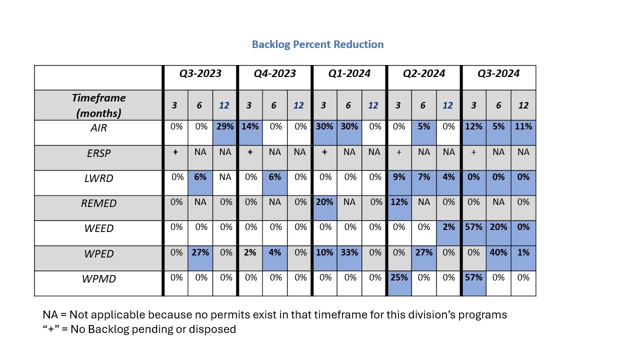 It is important to note that DEEP continues to keep pace and work continues within available resources to process permit applications. We are continually pursuing improvement in meeting DEEP’s permit processing timeliness goals; however, it should be recognized that a significant portion of the applications not meeting timeliness goals are affected by applicant responsiveness, staffing, and/or enforcement issues that may halt progress. Efforts to reduce backlog and legacy applications may compete with efforts to address timely efforts until there are far fewer backlog and legacy applications to focus on. Backlog permit applications are defined as permit applications that are outside of their permit processing timeframe by 1 day to 1 year. Legacy permits are defined as permit applications older than five years. *Backlog details for this quarter are included below the timeliness chart. Legacy permit applications are tracked in a separate Legacy Permit Dashboard.