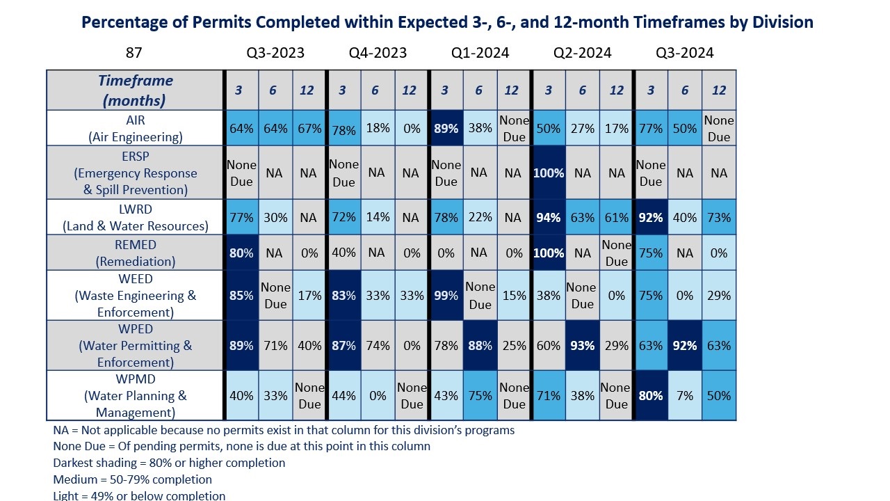 Based upon the extent of review, public notice requirements, potential environmental risk, and technical complexity, each type of permit (i.e., Permit by Rule, General Permit, or Individual Permit) will fall under one of four different timeframes – immediate, within 3 months, within 6 months, or within 12 months.