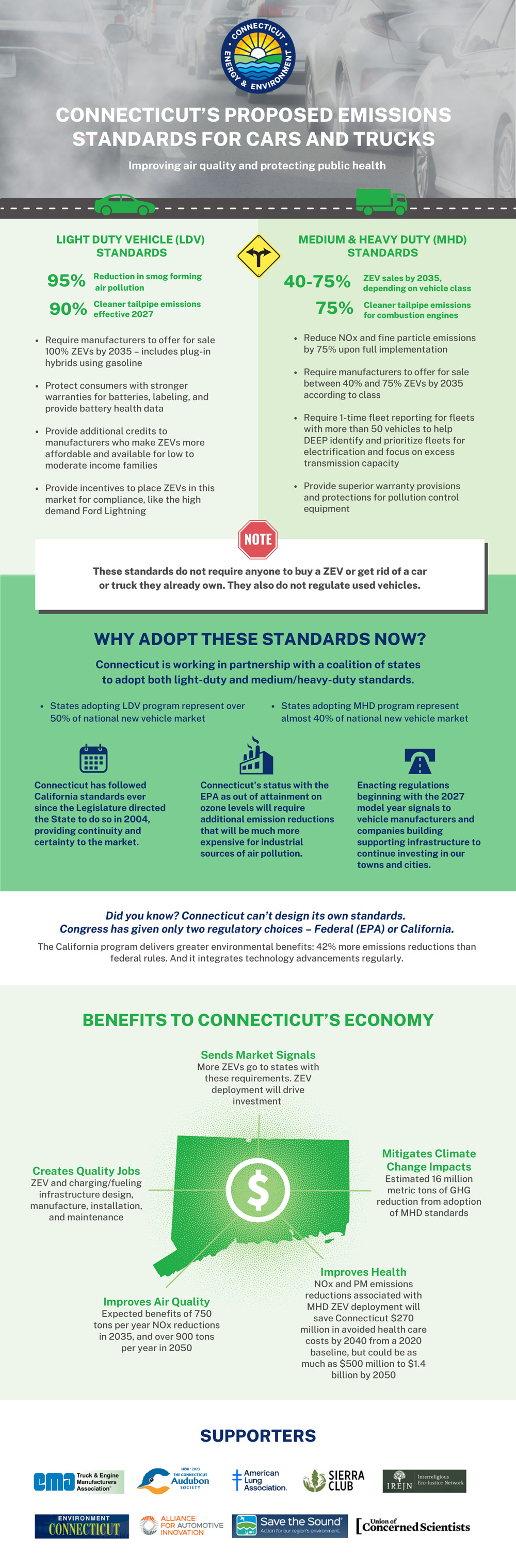 Connecticut suffers from some of the worst air quality in the country, and emissions from cars and trucks account for most of the ozone forming air pollution in our state. The clean car standards are projected to reduce GHG air pollution by 30% by 2030, and the clean trucks standards are projected to reduce GHG air pollution by 18% by 2045. These standards could save the state anywhere from $272 million to $1.4 billion in avoided health care costs between now and 2050.