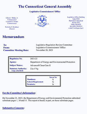 LCO’s Recommendation: The Legislative Commissioner’s Office, which provides nonpartisan legal counsel to the members of the Connecticut General Assembly and their staff, has recommended that Connecticut’s Legislative Regulation Review Committee (LRRC), a bipartisan legislative committee that reviews such standards, approve the state’s proposed emissions standards for both light-duty vehicles (cars) and medium and heavy-duty vehicles (trucks). Both LCO recommendations can be viewed here: