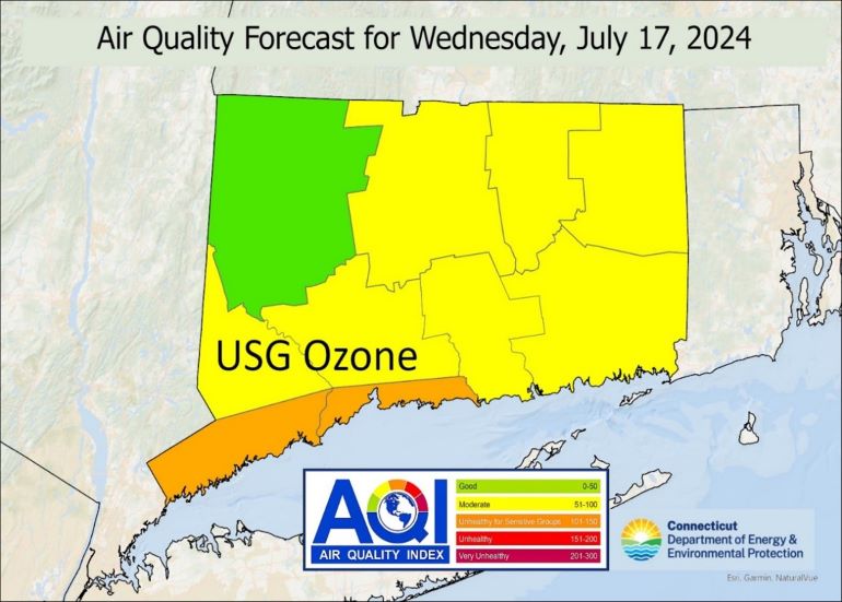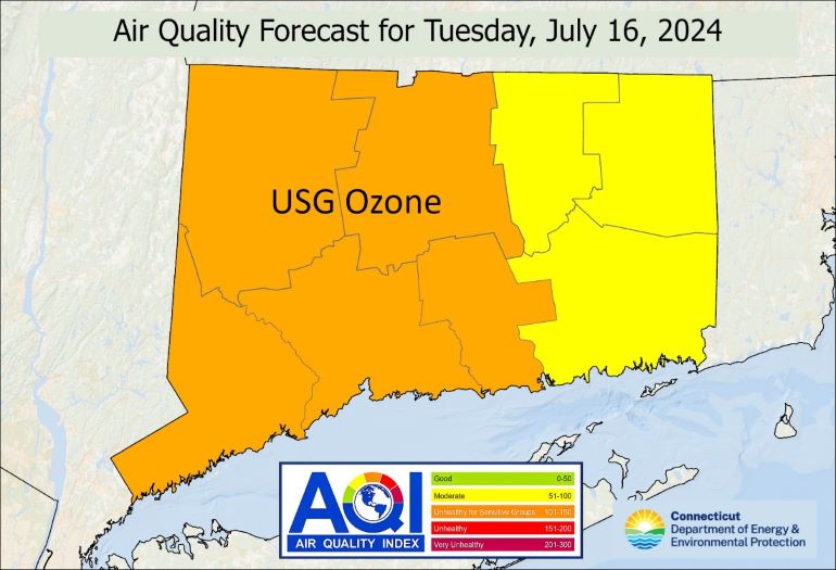 (HARTFORD) — Connecticut’s Department of Energy and Environmental Protection (DEEP) is expecting temperatures in the mid-to-upper 90s (˚F) beginning today, with high temperatures persisting into Wednesday. The National Weather Service has issued a Heat Advisory for the entire State through Wednesday. These hot temperatures will contribute to elevated ozone levels for western Connecticut on Tuesday and continuing along the coast on Wednesday. These levels may approach or exceed Unhealthy for Sensitive Groups (USG) levels for these parts of Connecticut.