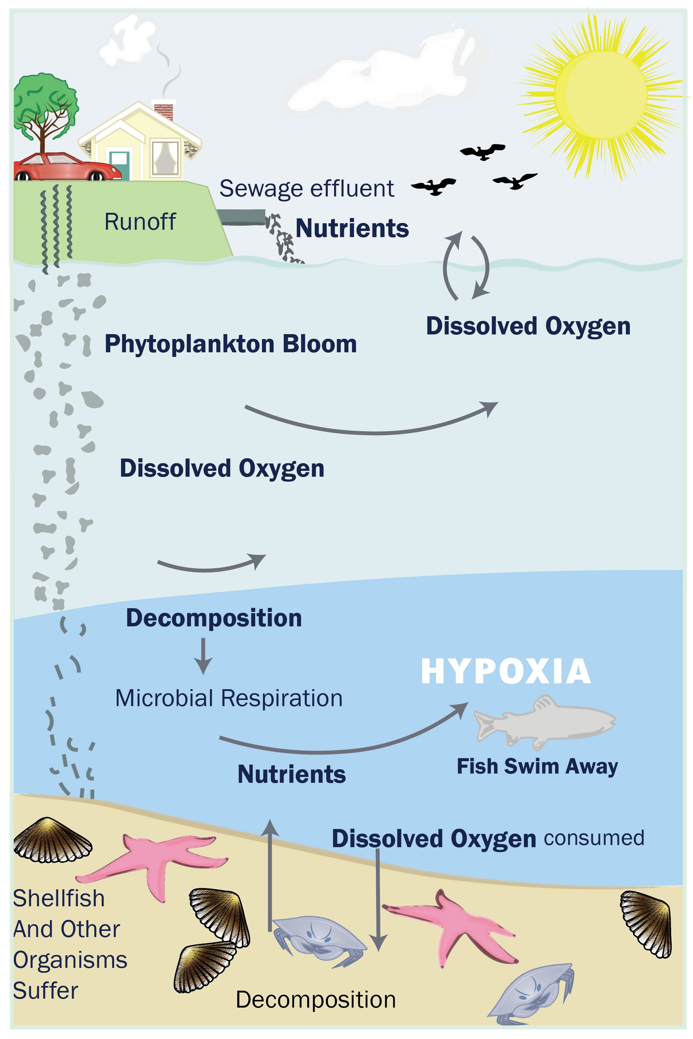 Each summer, the bottom waters in western Long Island Sound experience hypoxia, or very low levels of dissolved oxygen. Low dissolved oxygen impacts the survival of marine animals in the Sound. Extensive monitoring and modeling of Long Island Sound have identified the excessive discharge of nitrogen from human activities as the primary pollutant causing hypoxia. Nitrogen fuels the growth of algae in the Sound, which eventually decays, consuming oxygen in the process. There is enough nitrogen added by human activity to cause a hypoxia problem in the Sound each summer. Sources of nitrogen include:
