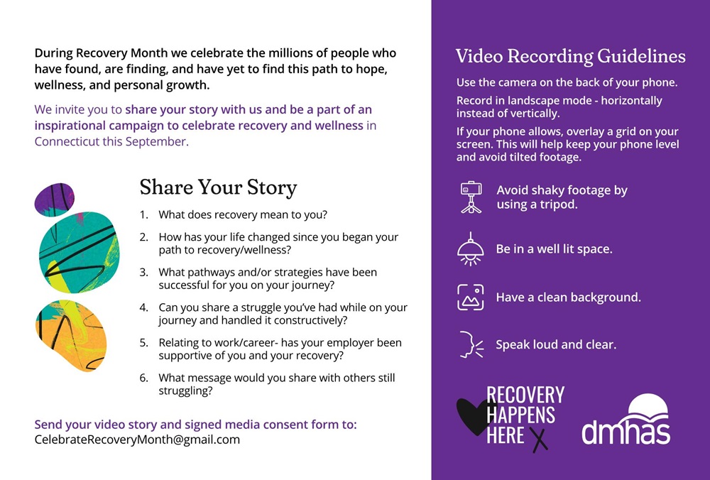 Film a 1-2 minute video describing your journey to recovery and how your life has changed and email it to us at CelebrateRecoveryMonth@gmail.com.