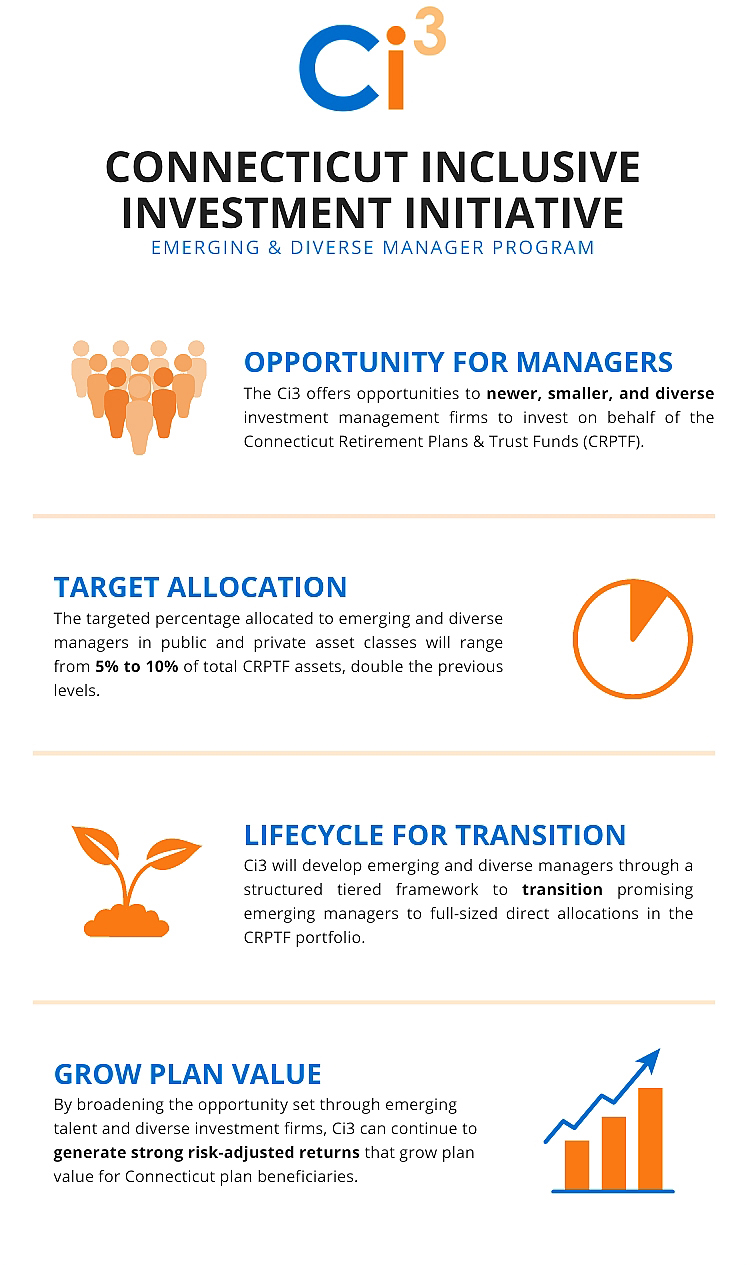 The Connecticut Inclusive Investment Initiative ("Ci3") is the restructured Emerging and Diverse manager program of the Connecticut Retirement Plans and Trust Funds ("CRPTF"). CI3 targets investments with emerging and diverse managers across both public and private asset classes and will provide a pathway for growth of the best emerging managers in the industry. Updated Policy Statement.