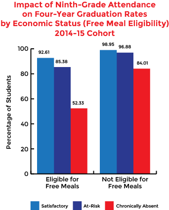 Being chronically absent significantly affects a student’s ability to read at grade level, perform academically, and graduate on time. Children who are chronically absent in both kindergarten and first grade are much less likely to read proficiently by the end of third grade (Campaign for Grade Level Reading and Attendance Works, 2014). By sixth grade, chronic absence is a key early indicator of dropout from high school (Baltimore Education Research Consortium, 2011). By ninth grade, attendance may be a better indicator of dropout than eighth-grade test scores (Allensworth, 2014). The graph above displays attendance in grade 9 and graduation in four years by meal eligibility in 2014-15.